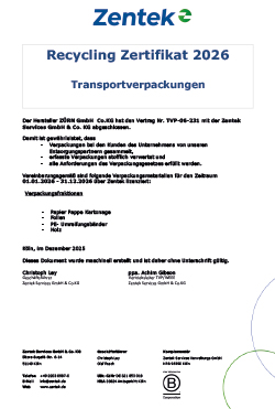 In order to ensure sustainable and efficient disposal, we work together with Zentek, a renowned provider of disposal and recycling solutions. Zentek supports us in continuously optimizing our recycling processes and ensuring resource-saving recycling. ZÜRN GmbH & Co. KG is listed in the manufacturer register under the registration number DE2675434833427 as a company with “packaging not subject to system participation obligation”.